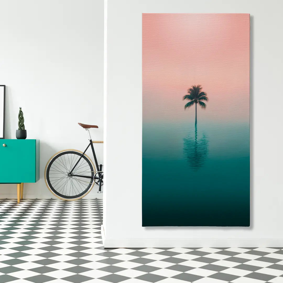 Minimalistisch, beruhigend und modern – das Leinwandbild „Einsame Palme im Sonnenuntergang“ vereint weiche Pastellfarben mit tropischer Ruhe. Die Palme steht still im Wasser, während sanfte Rosé- und Türkistöne den Himmel füllen.