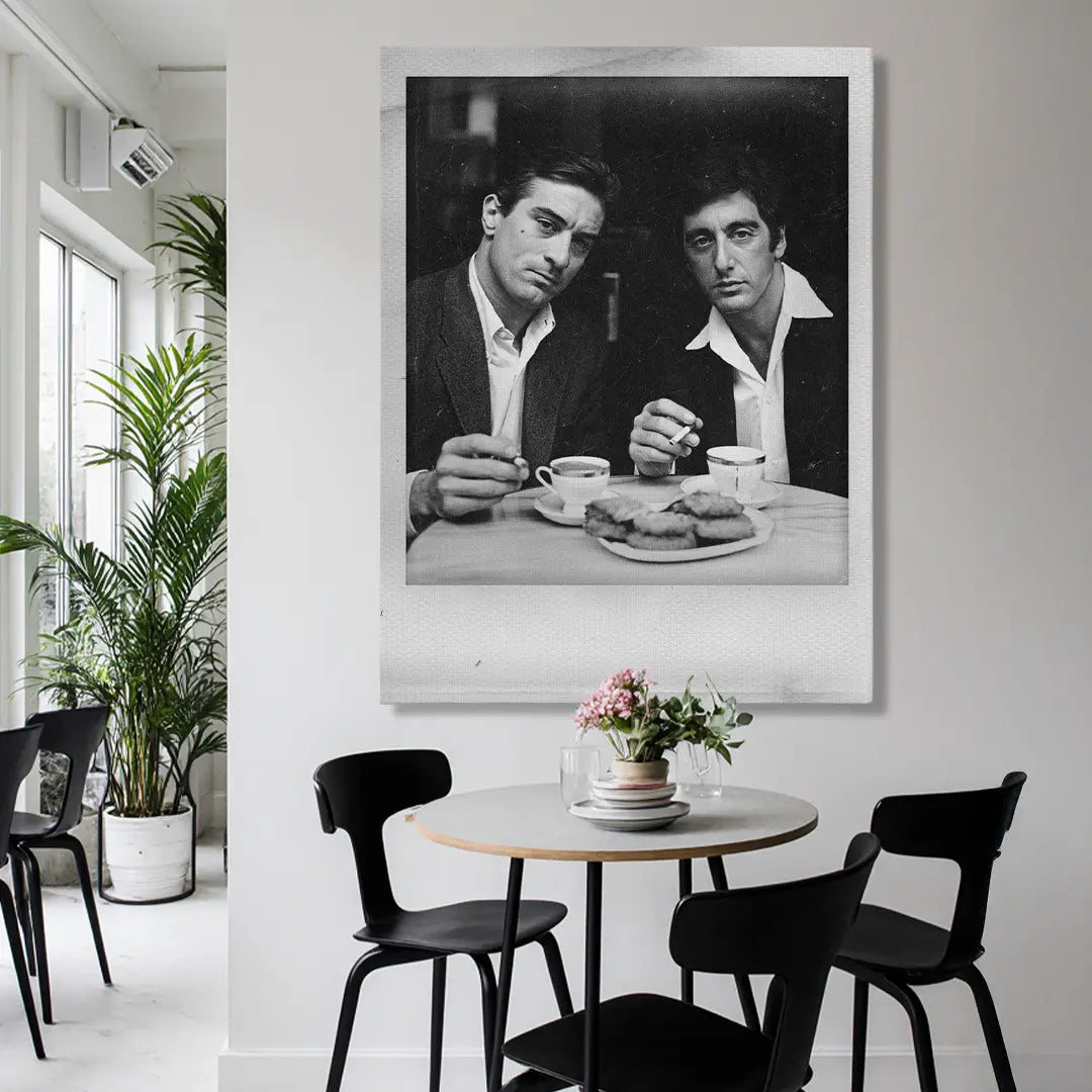 Bringe zeitlose Eleganz in dein Zuhause mit dieser einzigartigen Schwarz-Weiß Leinwand. Die Szene zeigt zwei Männer an einem Café-Tisch, vertieft in Espresso und Zigarette – ein Bild voller Atmosphäre, Stil und urbaner Coolness. Die starke Kontrastwirkung, die feinen Körnungen und der Retro-Look machen dieses Kunstwerk zu einem echten Blickfang in Wohnzimmer, Büro oder Café.